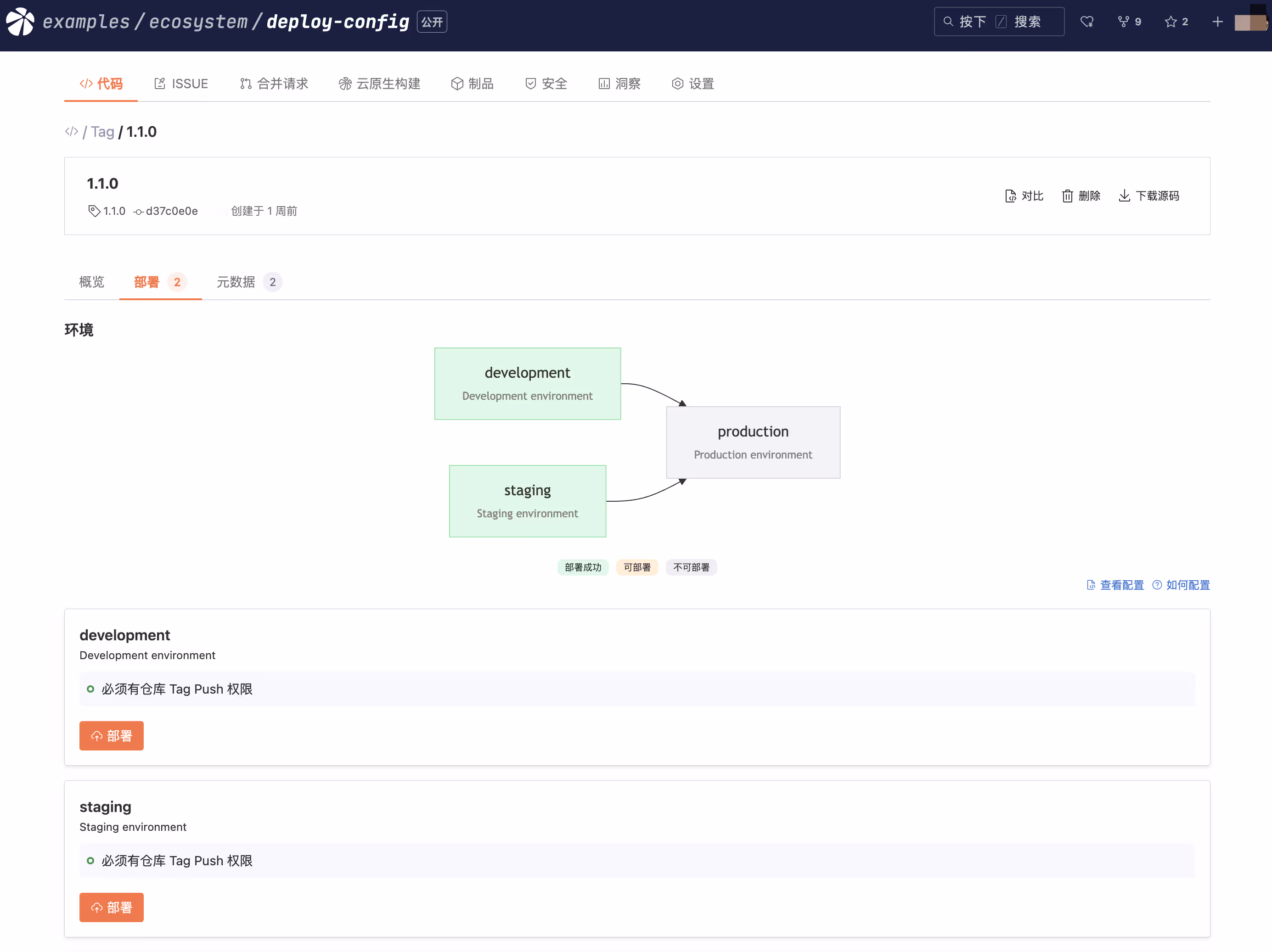 需有 仓库写权限 且有 推送 Tag 权限的用户才能进行部署操作。